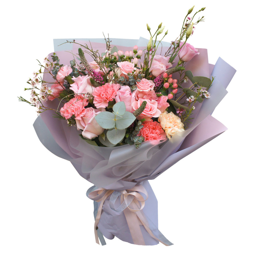 Роза одноголовая розовая, гвоздика розовая и кремовая, ваксфлауэр, вероника, гиперикум, эвкалипт. Упаковка (лента, пленка, крафт, сетка, пленка матовая)