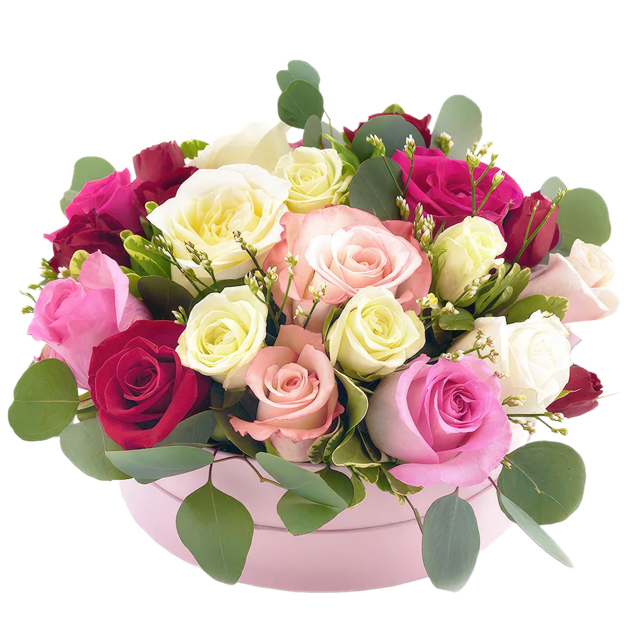 Роза одноголовая микс (кремовая, белач, нежно-розовая, розовая), зелень. Упаковка (шляпная коробка, квадратный бокс, коробка сердце, оазис)
